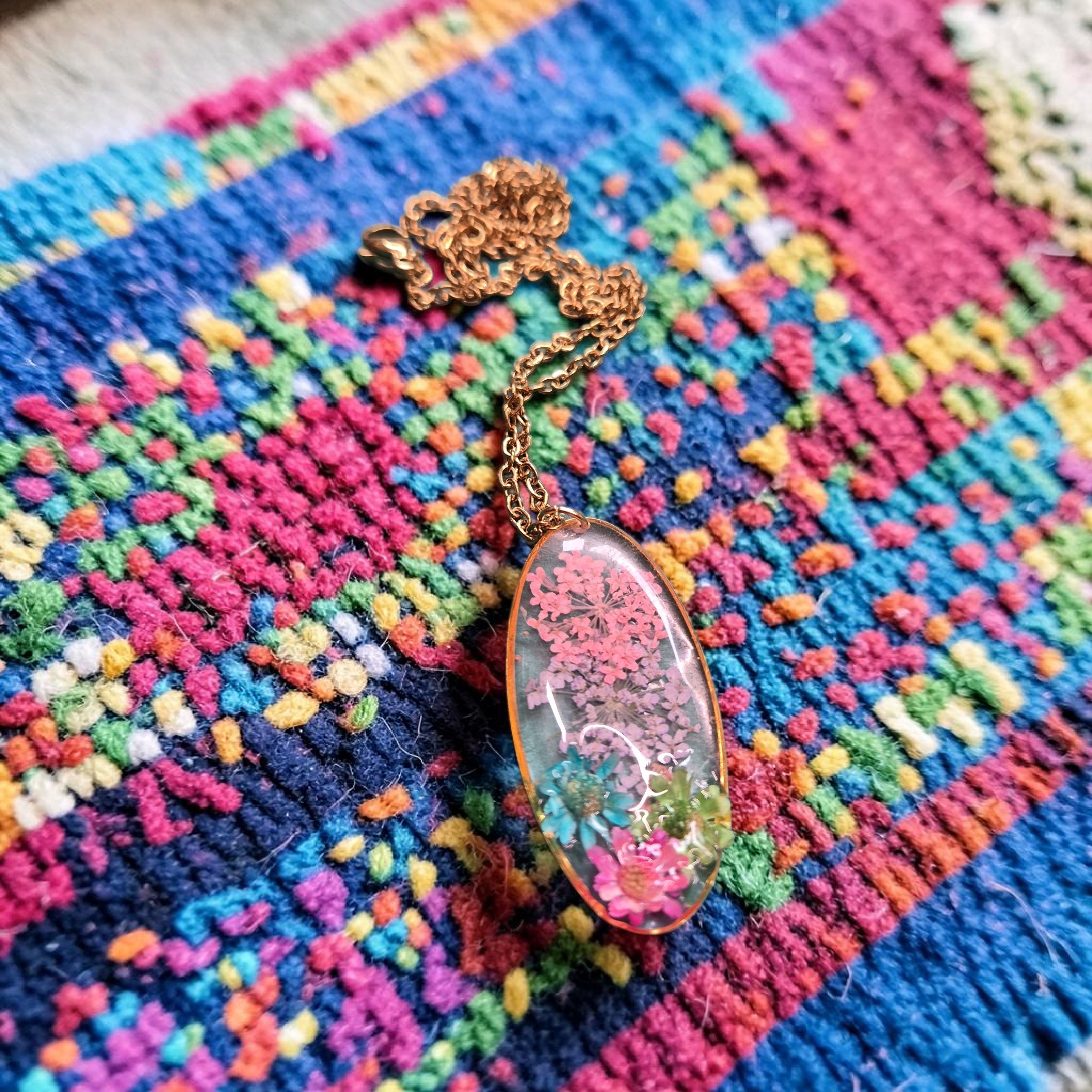 Mooie goudkleurige ovale hanger met gedroogde bloemetjes
