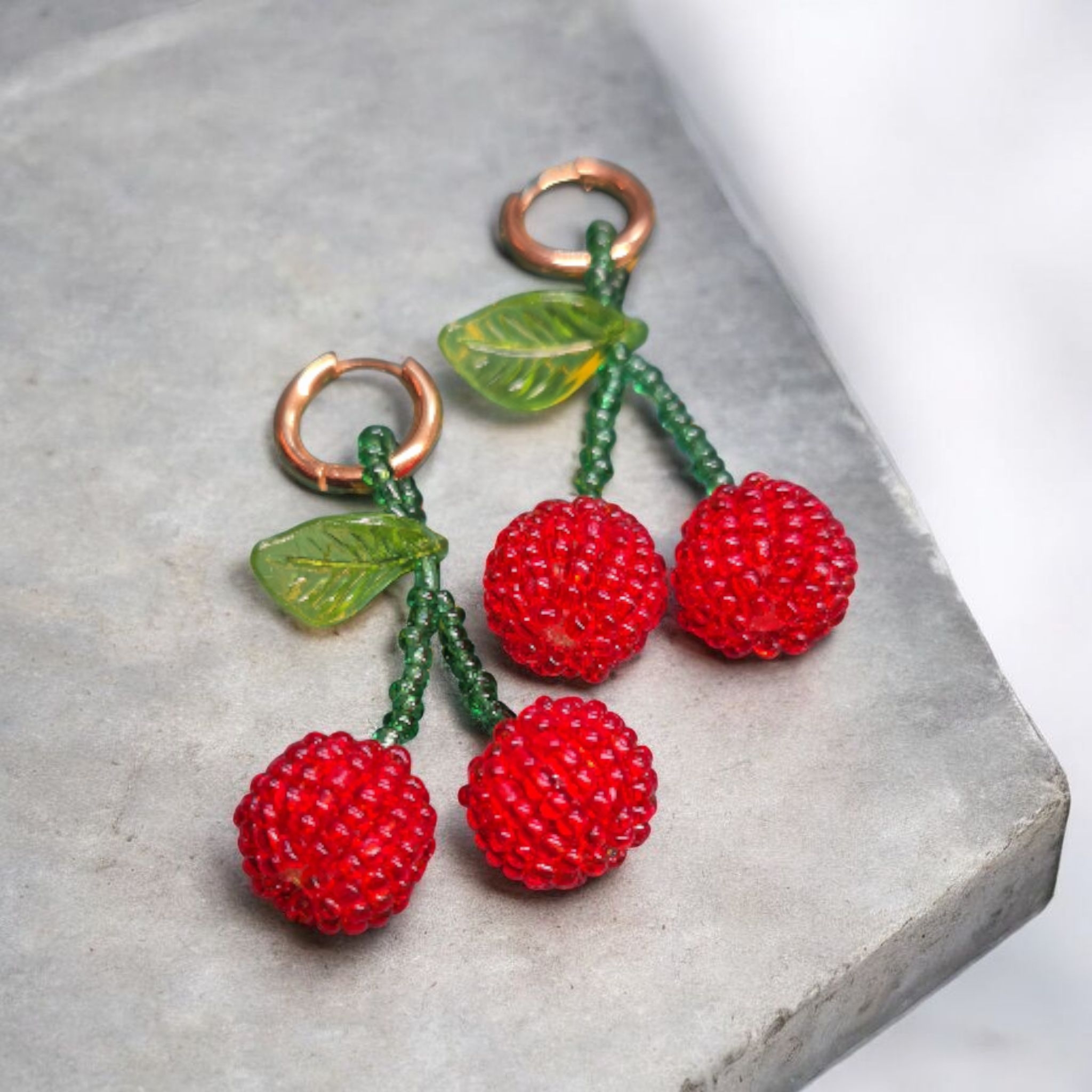 Mooie lange kersen uit kralen aan rvs ronde hangertjes