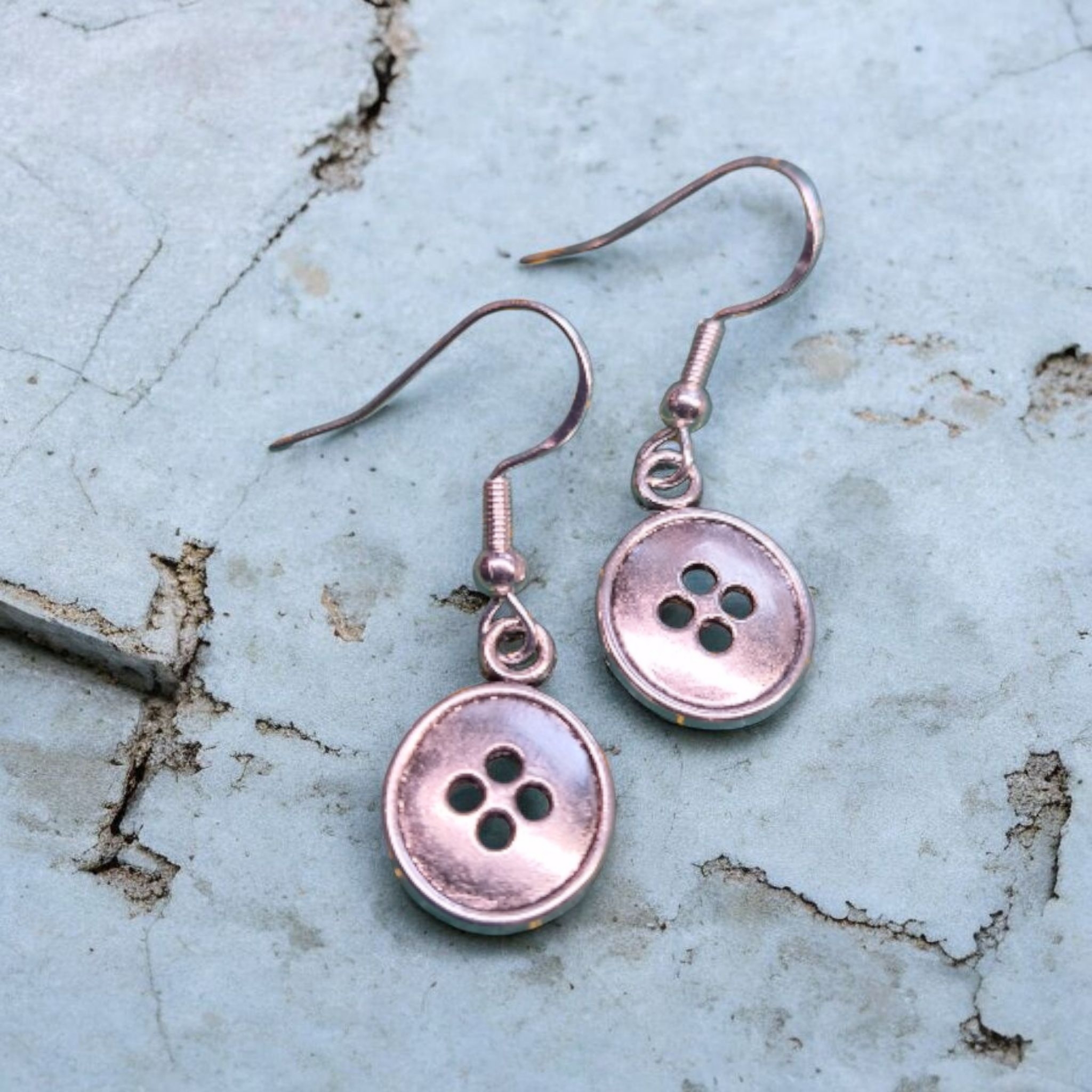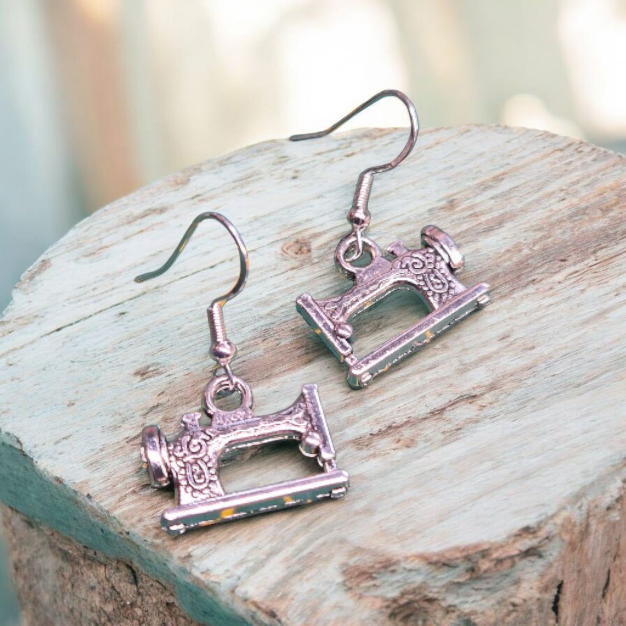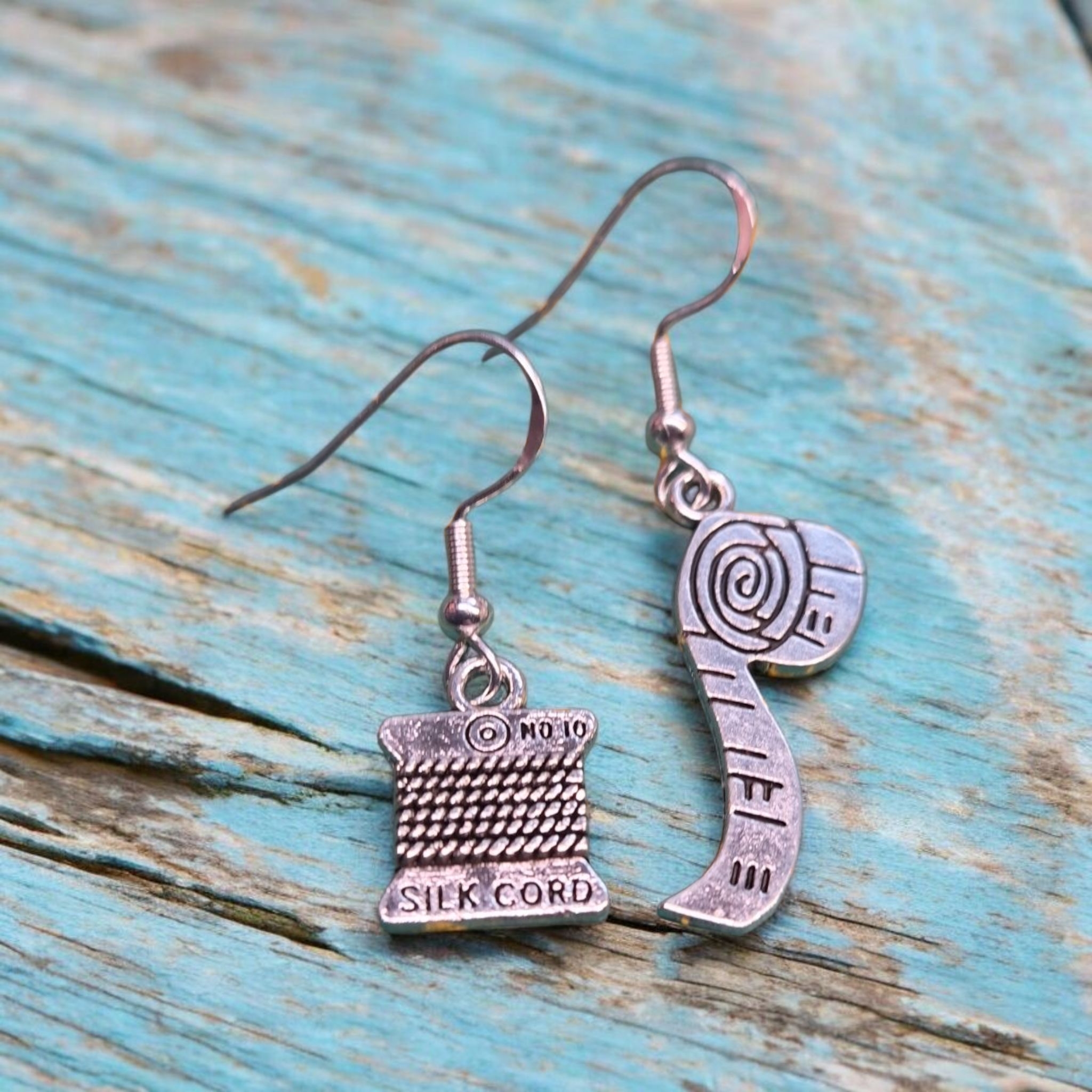 Zilverkleurige hangertjes in thema van naaien knopen, naaimachine, lintmeter en garen