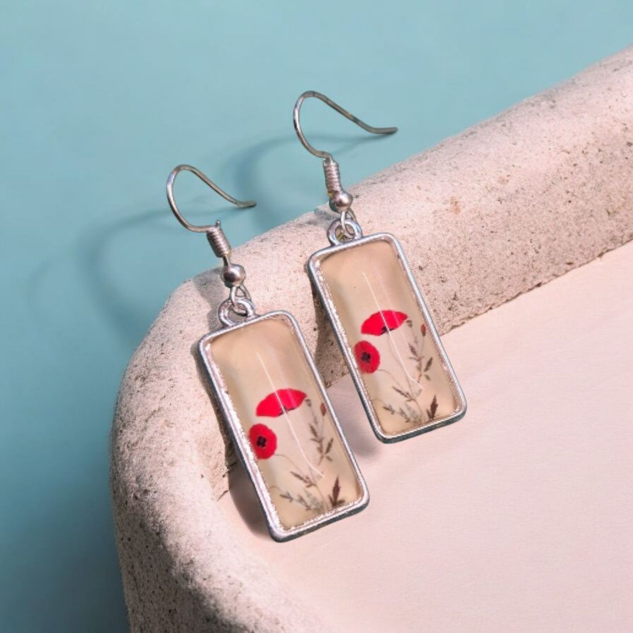 Zilverkleurig rechthoekige hangers met klaprozen aan sterling zilveren oorhaakjes