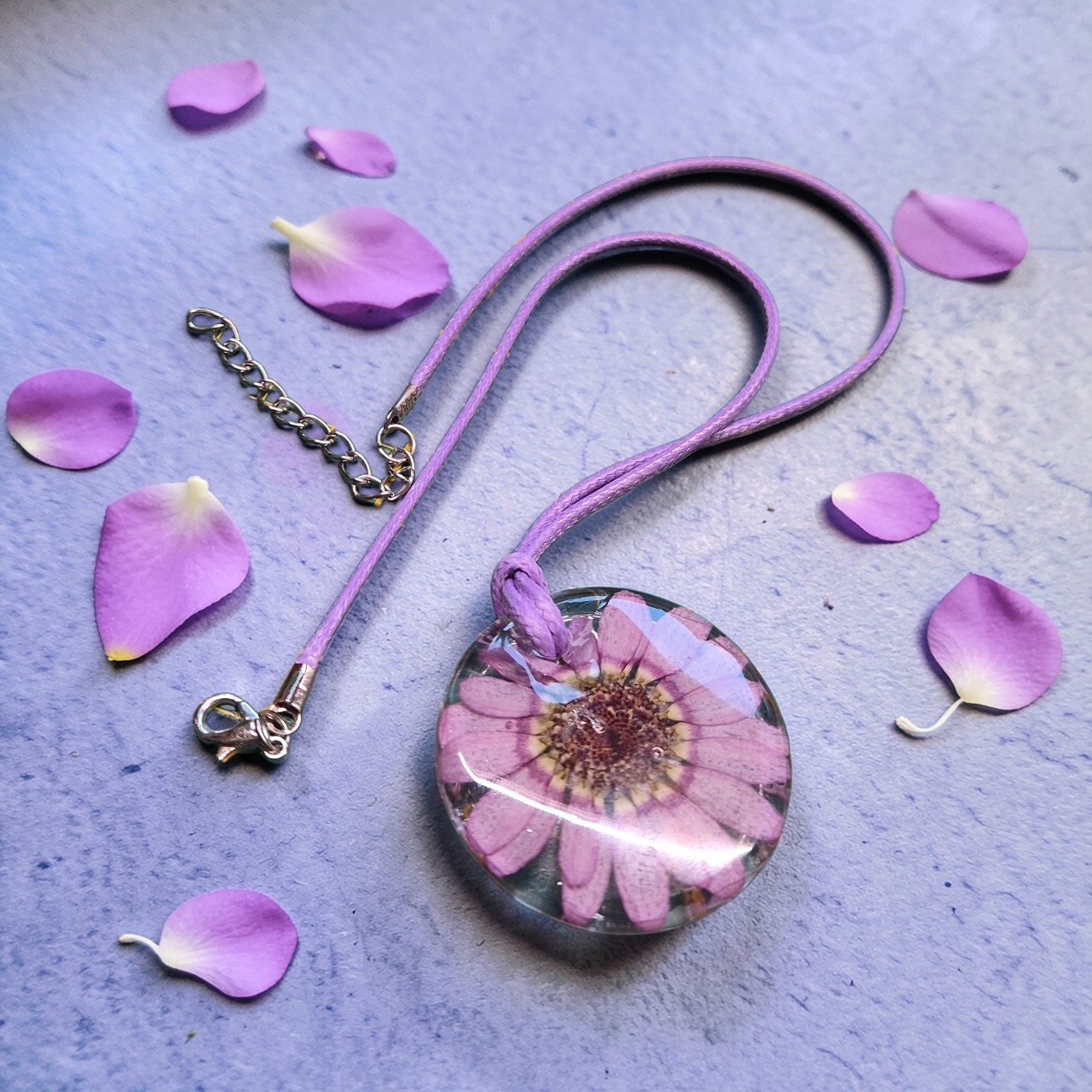 Mooie paarse bloemetjes gedroogd en bewerkt met epoxy