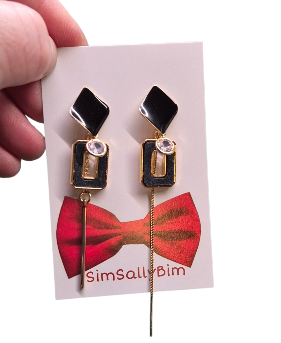 Mooie goudkleurige verschillende oorbelletjes met zwarte en goudkleurige langste oorbel is 10cm