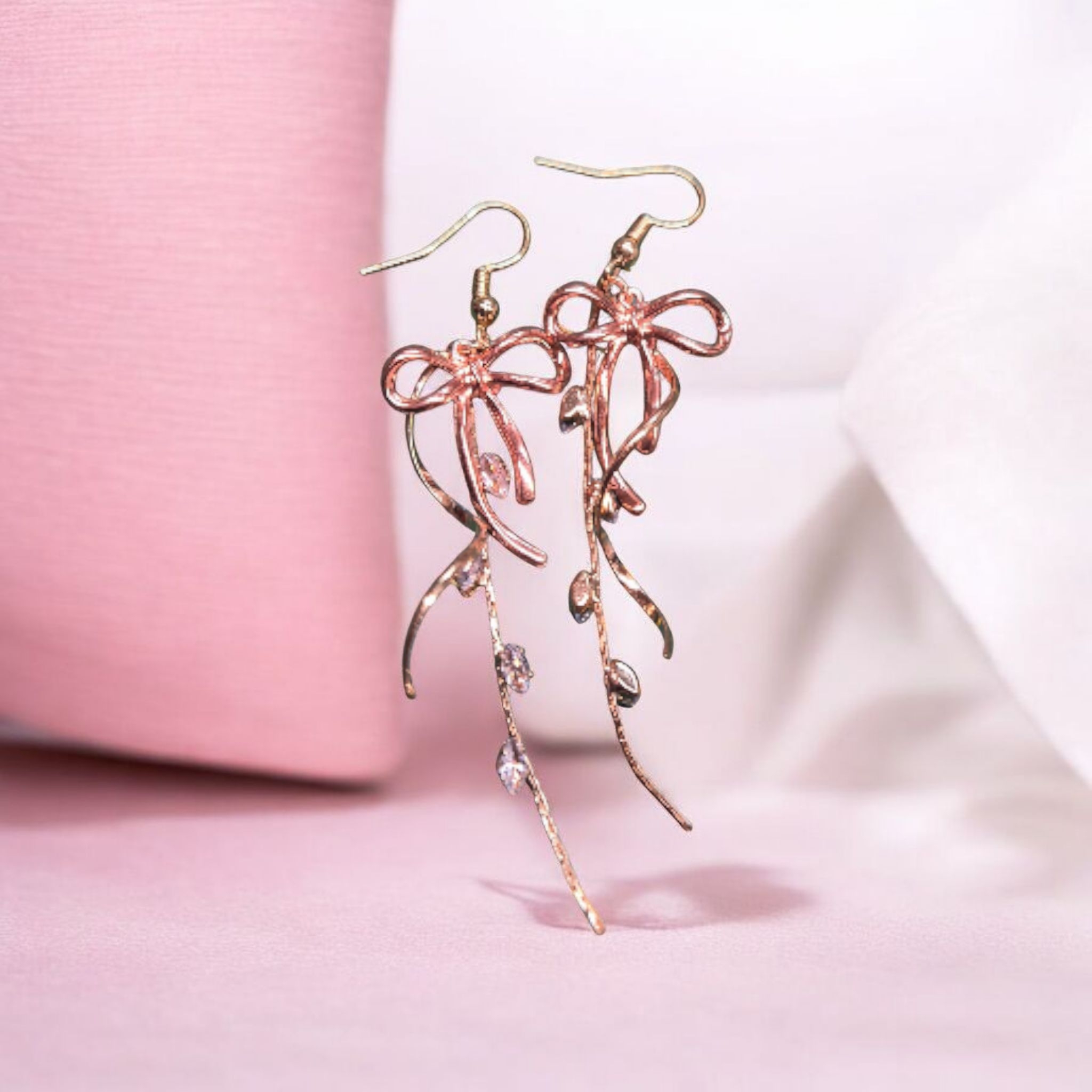 Mooie rosé strik met versiering aan 18k vergulde oorhaakjes