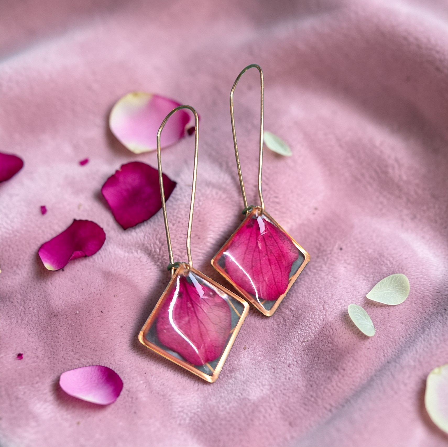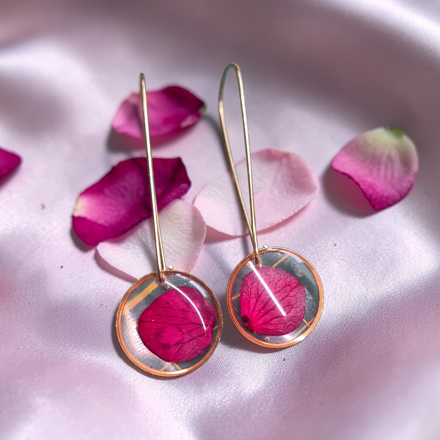Ronde goudkleurige hangertjes met rozenblaadjes in epoxy aan lange rvs haakjes