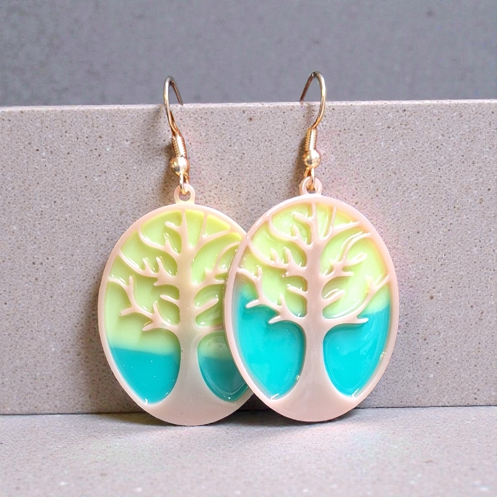 Mooie handgemaakte epoxy hangers aan 18k vergulde oorhaakjes levensboom Tree of life
