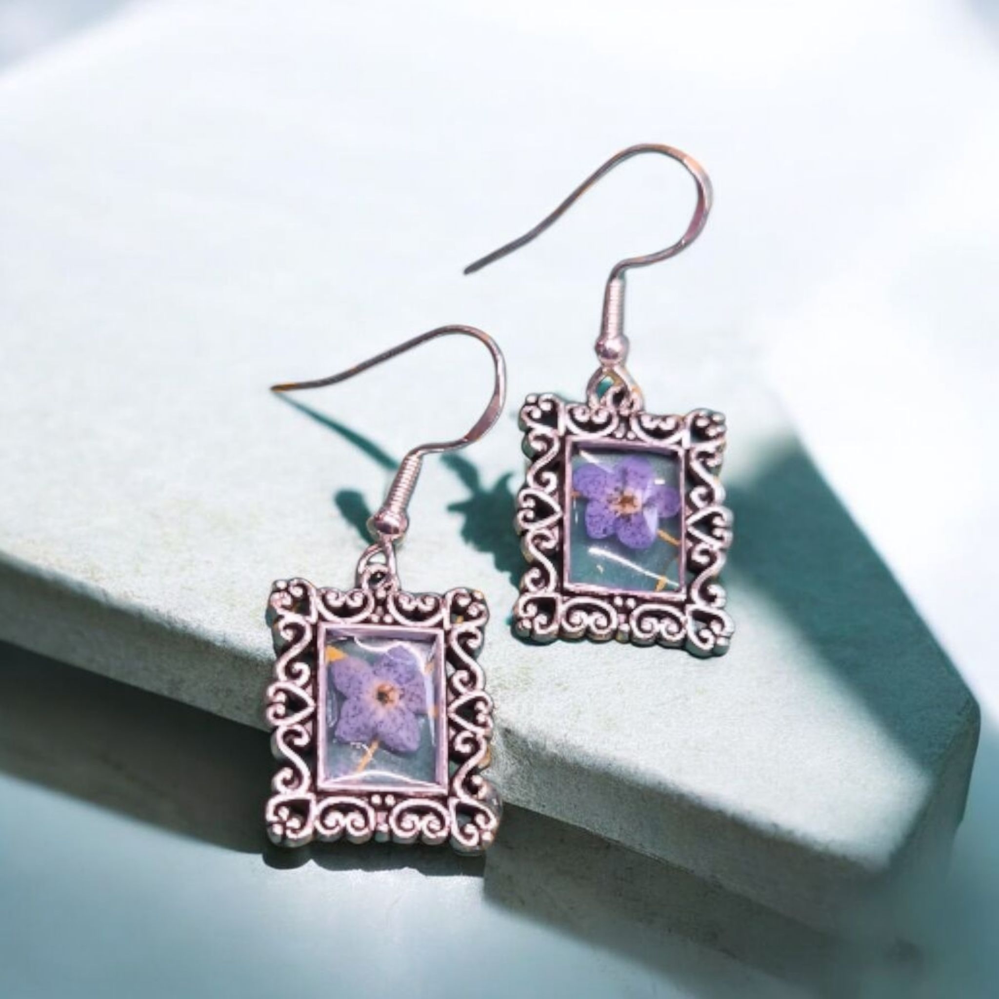 Miniatuur fotokadertjes met echte Vergeet-mij-nietjes aan sterling zilveren oorhaakjes