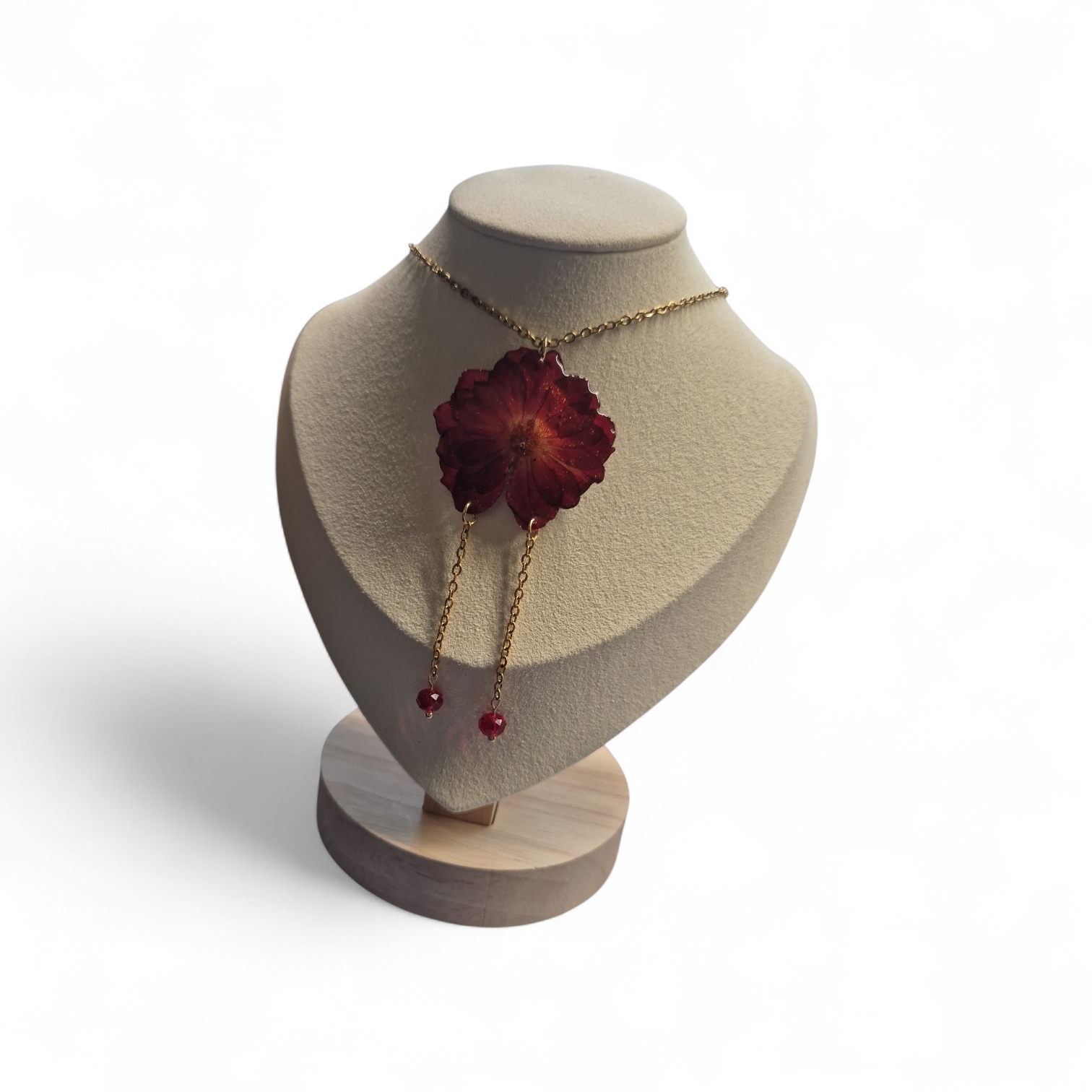 Echte rode bloem gedroogd en bewerkt met epoxy met facetkraaltjes aan rvs ketting