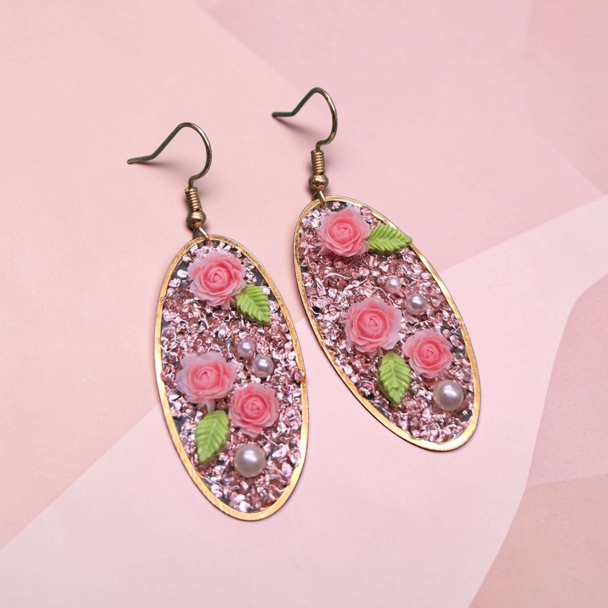 Grote ovale hangers met roosjes en epoxy aan 18k vergulde oorhaakjes