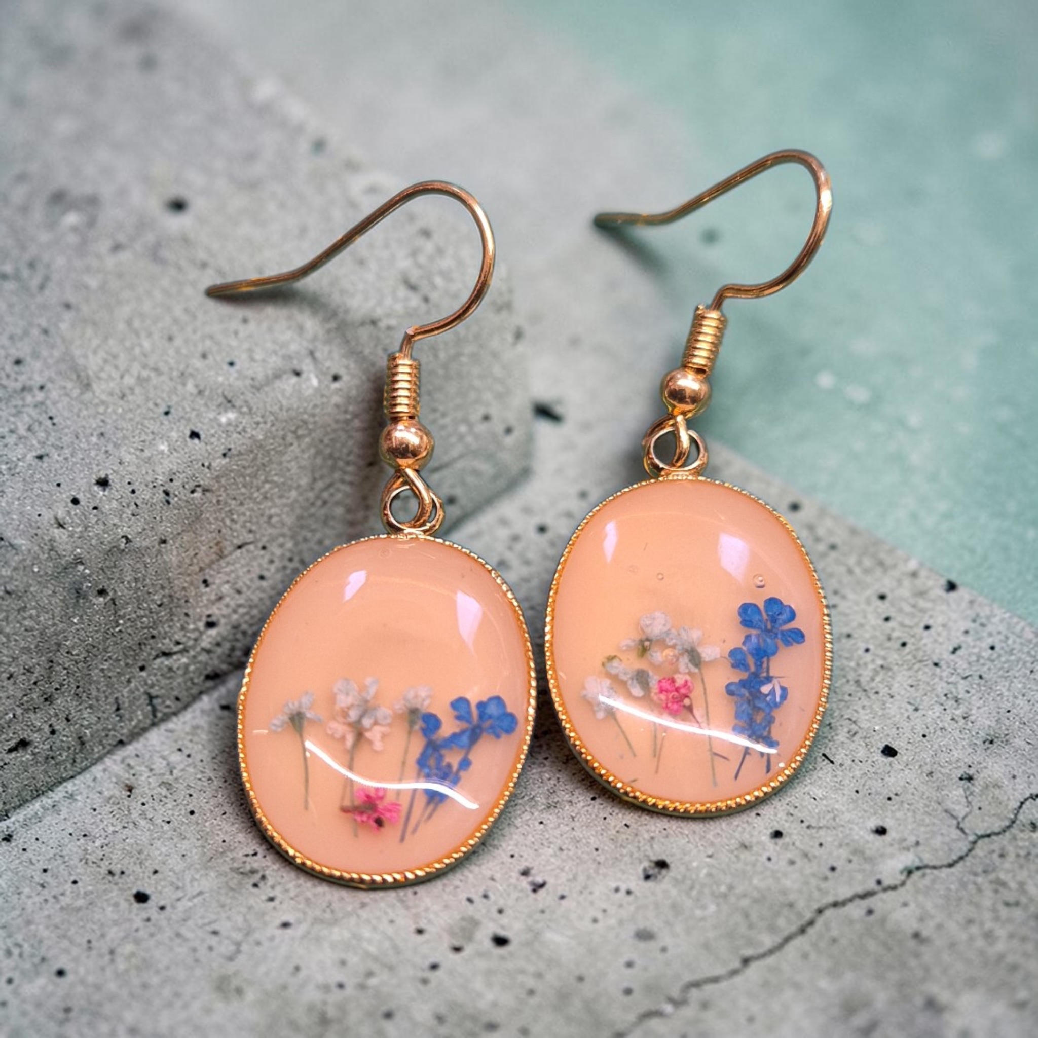 Mooie goudkleurige settings met gedroogde bloemetjes aan 18k vergulde oorhaakjes