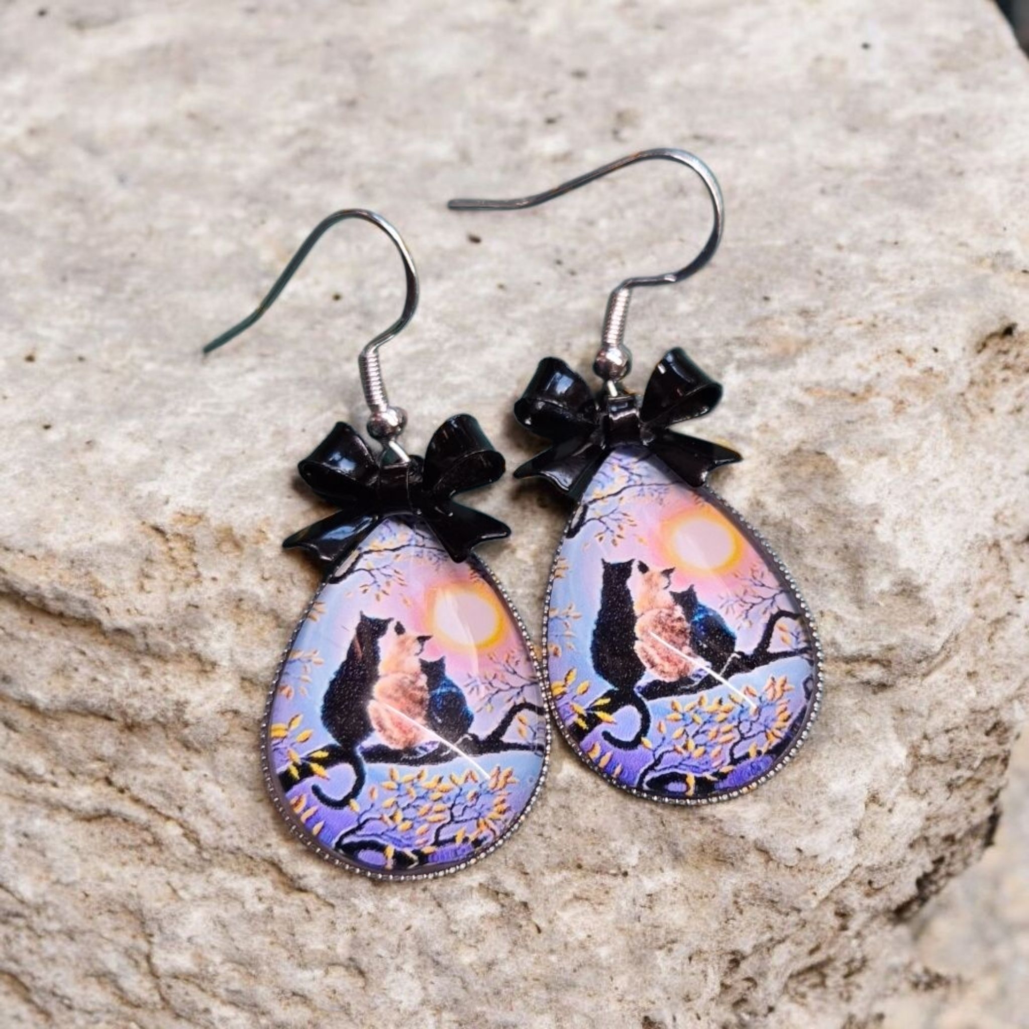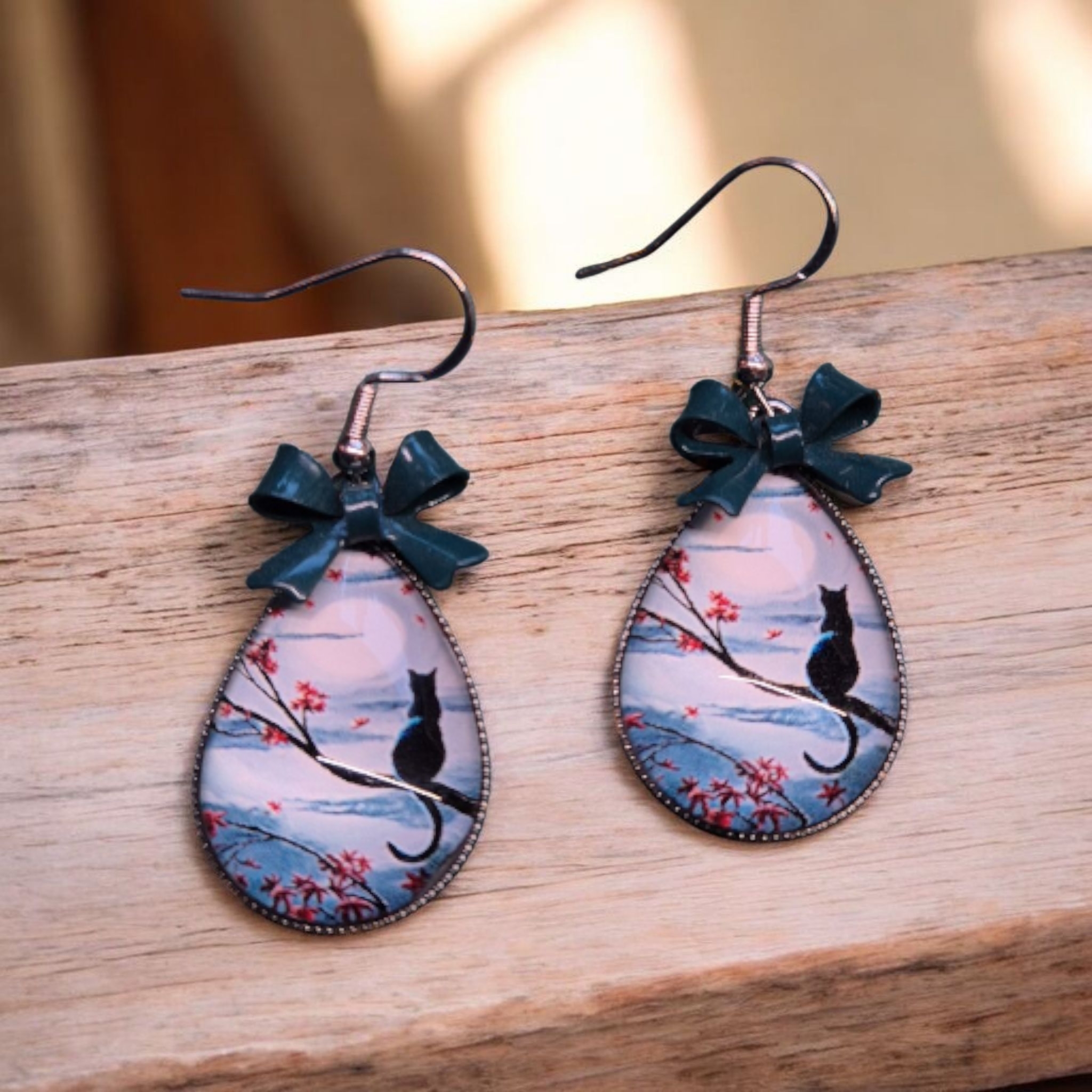 Mooie druppels met kattenprint en strikje aan sterling zilveren oorhaakjes