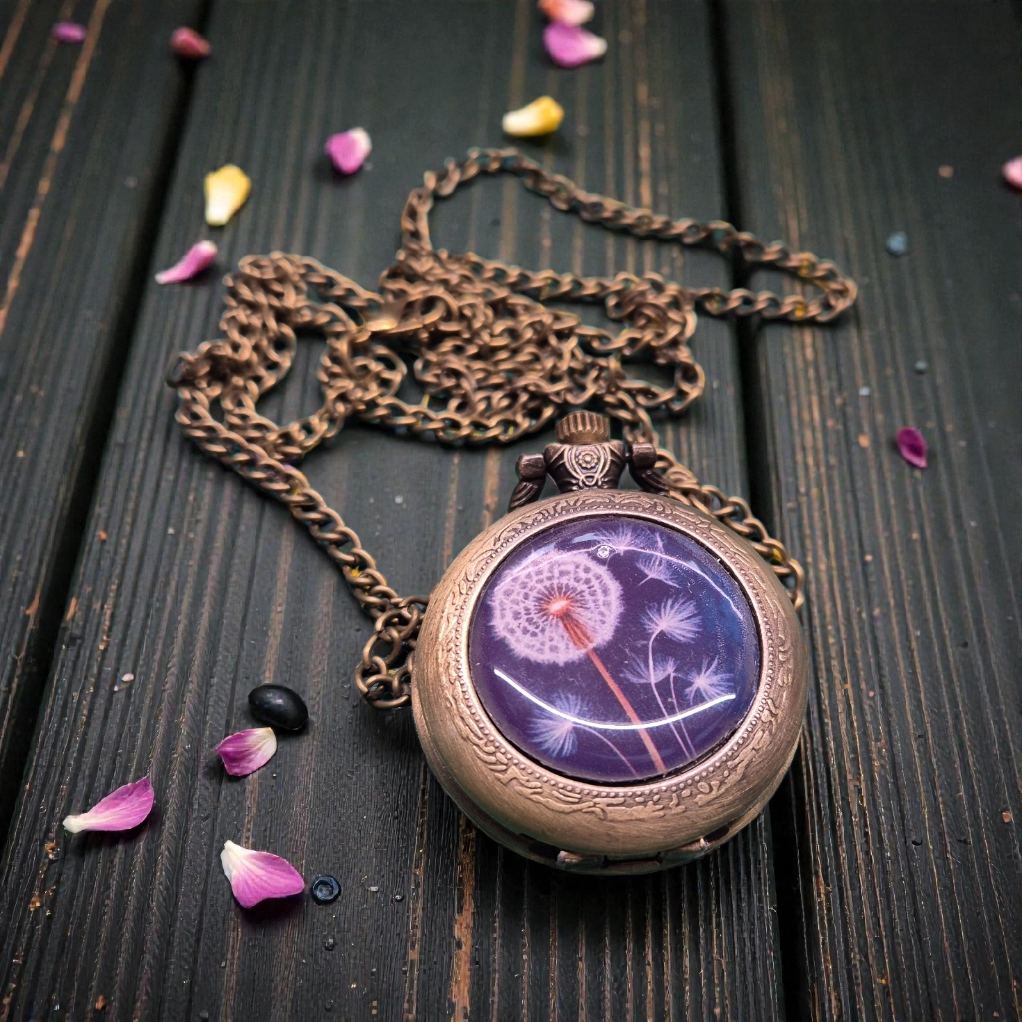 Mooie zakhorloge met wensbloem aan lange bronskleurige ketting