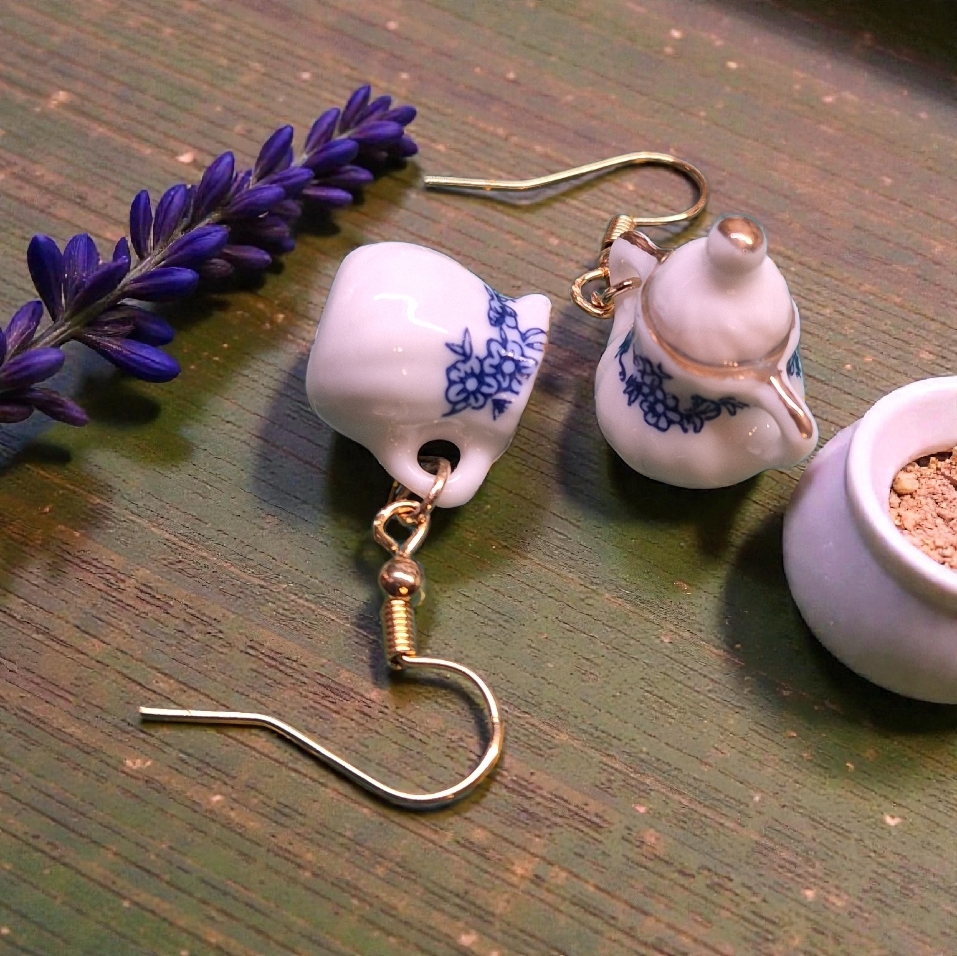 Miniatuur porseleinen melk en suikerpotje aan 18k vergulde oorhaakjes ...