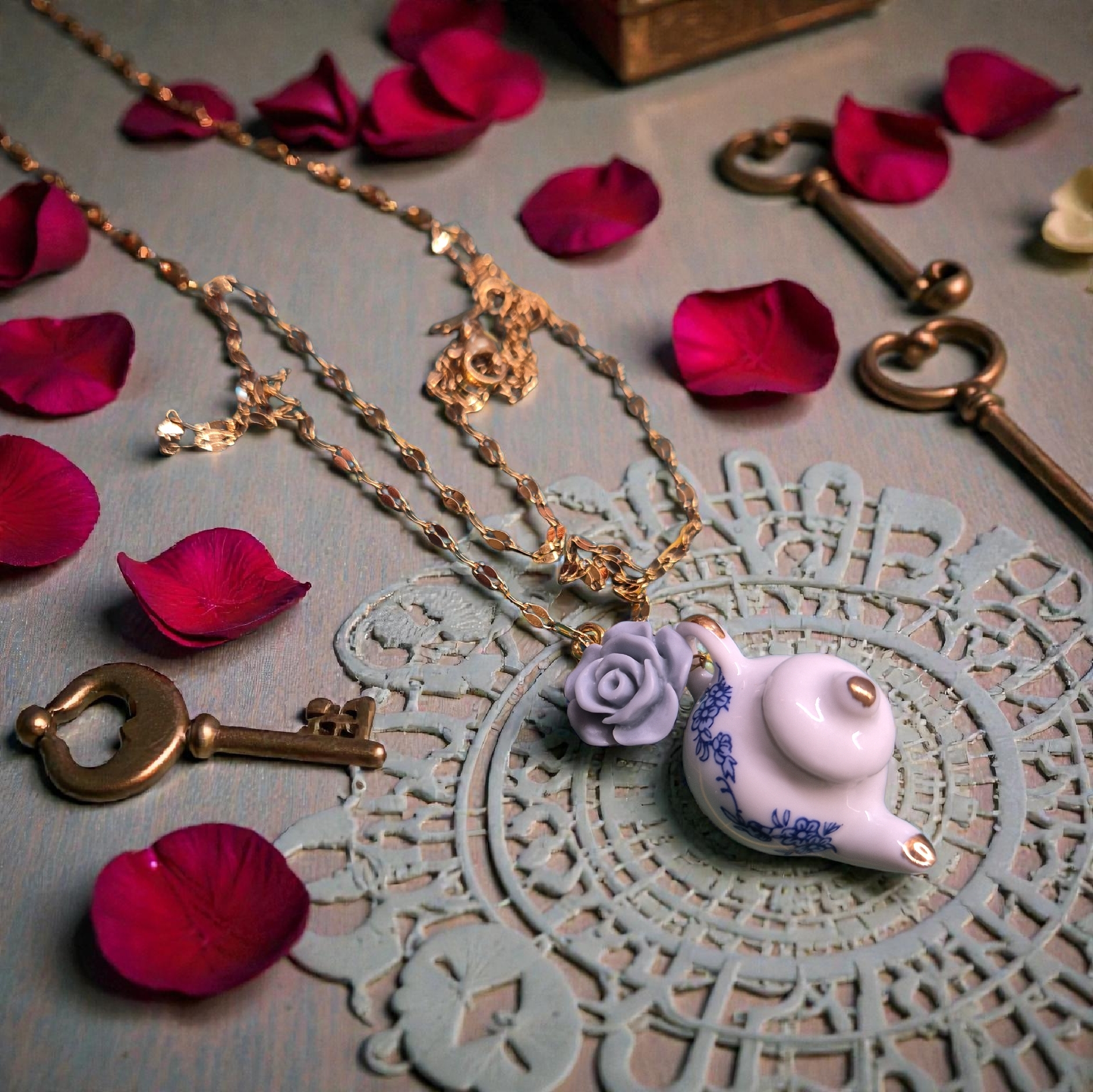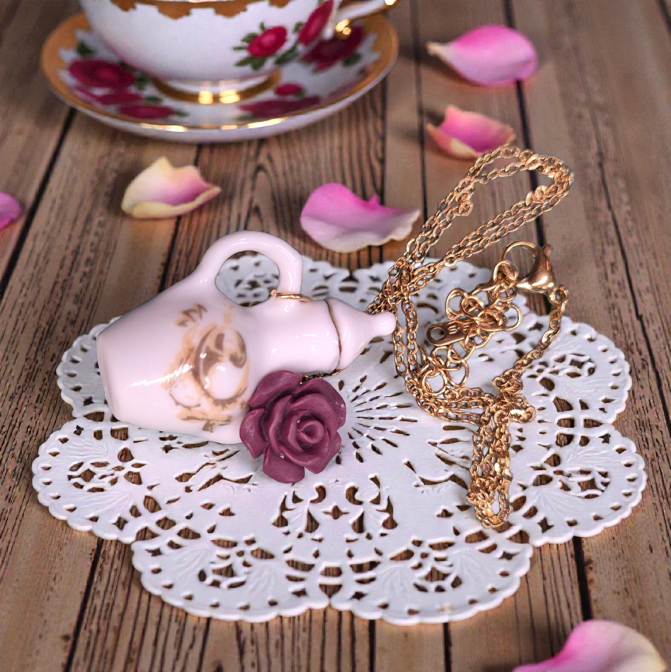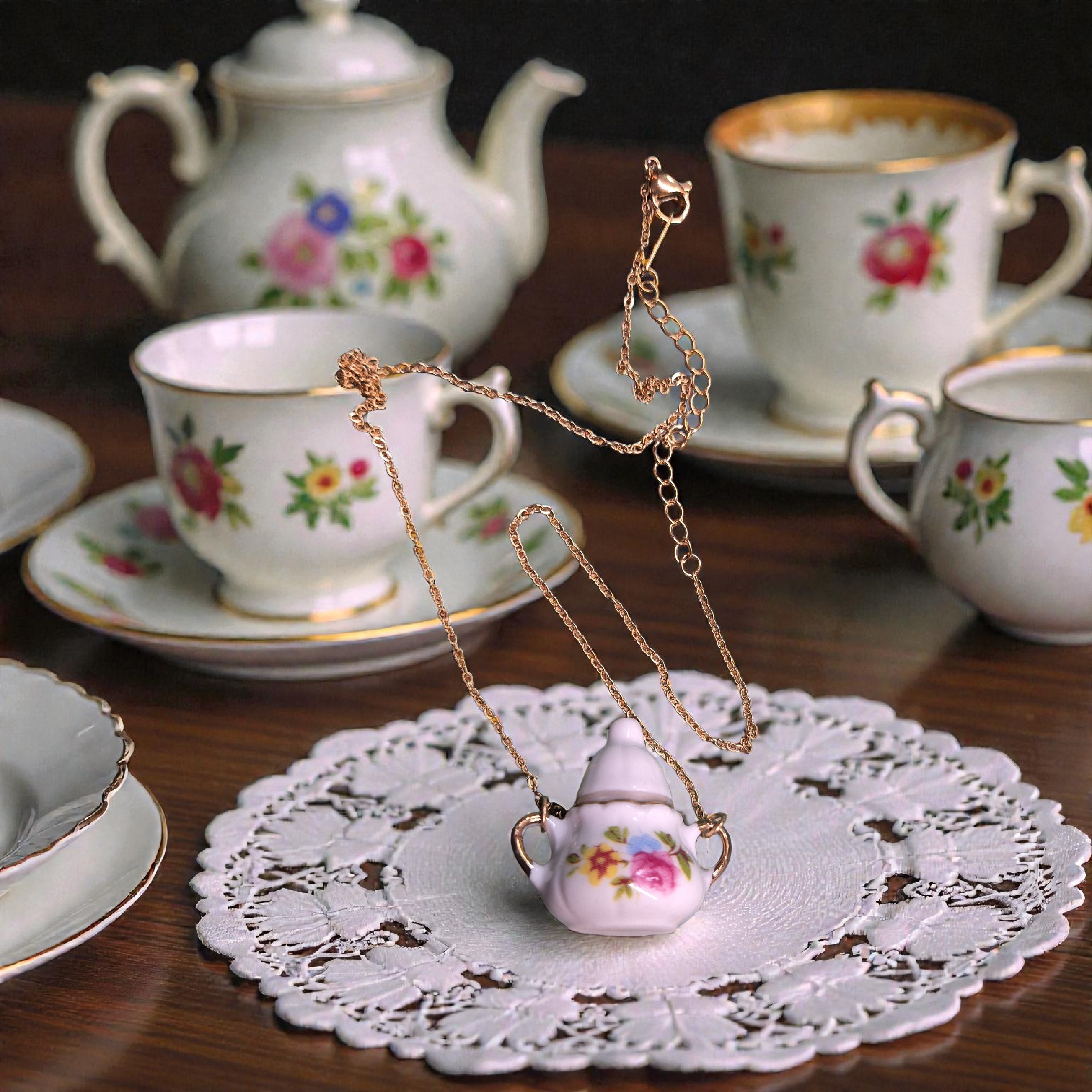 Porseleinen theepotje met roosje aan rvs ketting ...