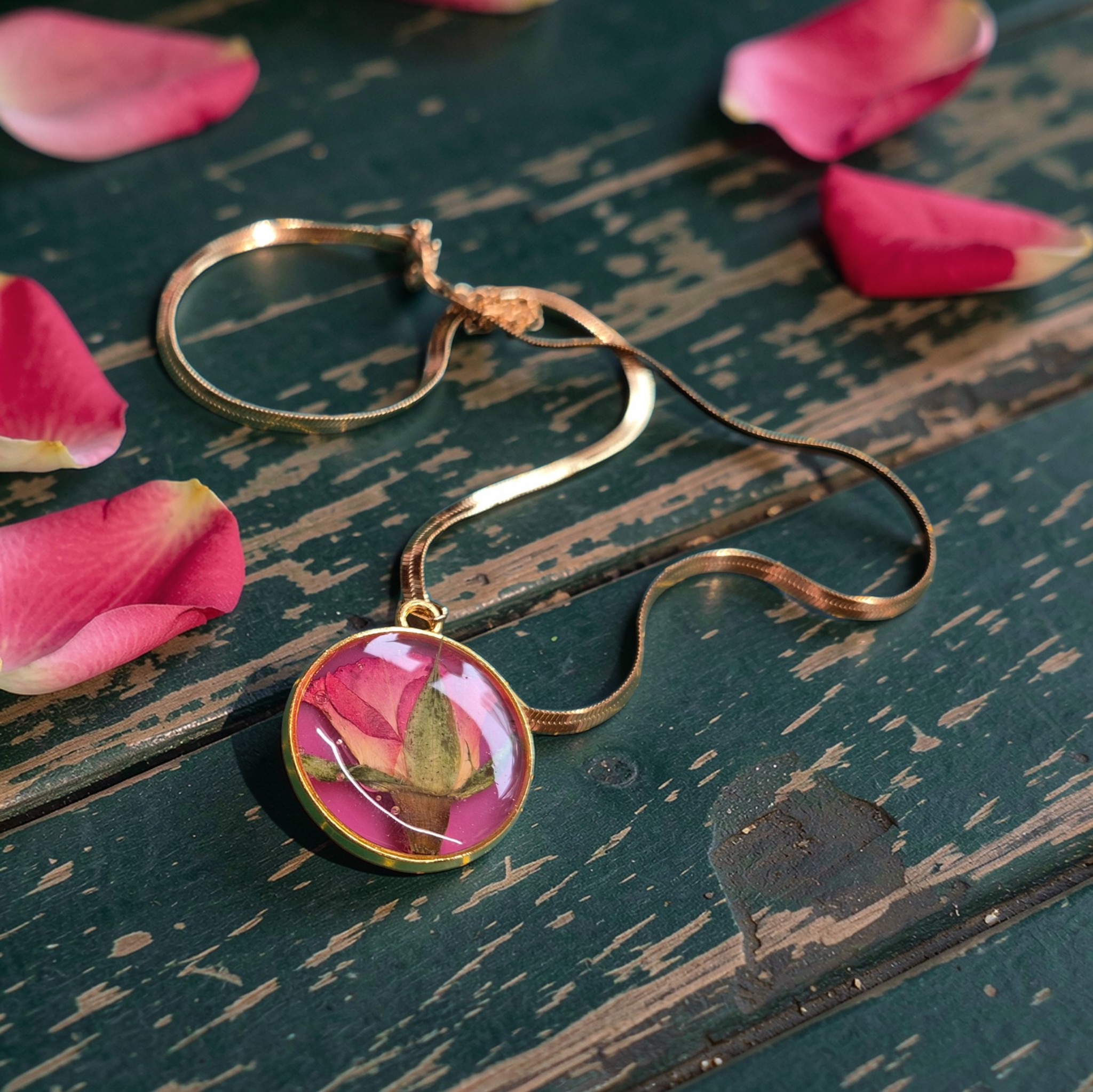 Mooie handgemaakte ketting met gedroogde roos in epoxy