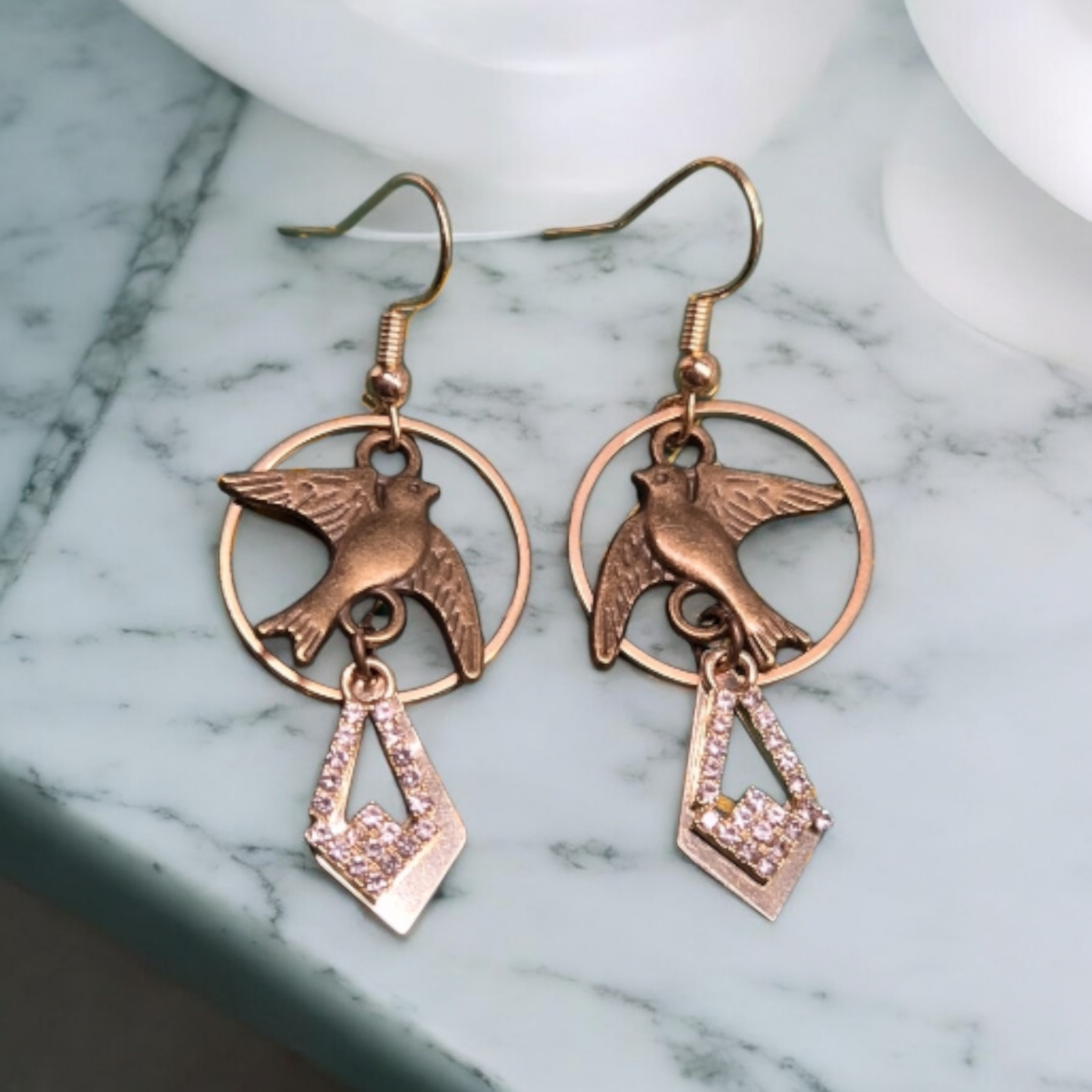 Bronskleurige vogeltjes met goudkleurige ring en rhinestone hangertjes