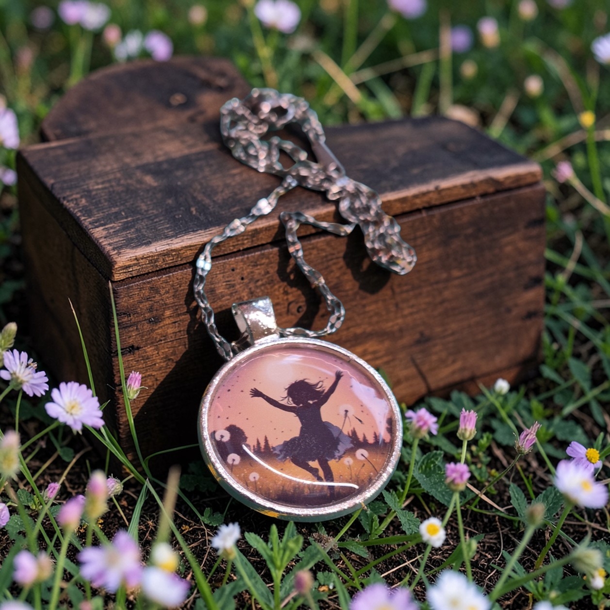 Zilverkleurige ketting met meisje tussen wensbloemen