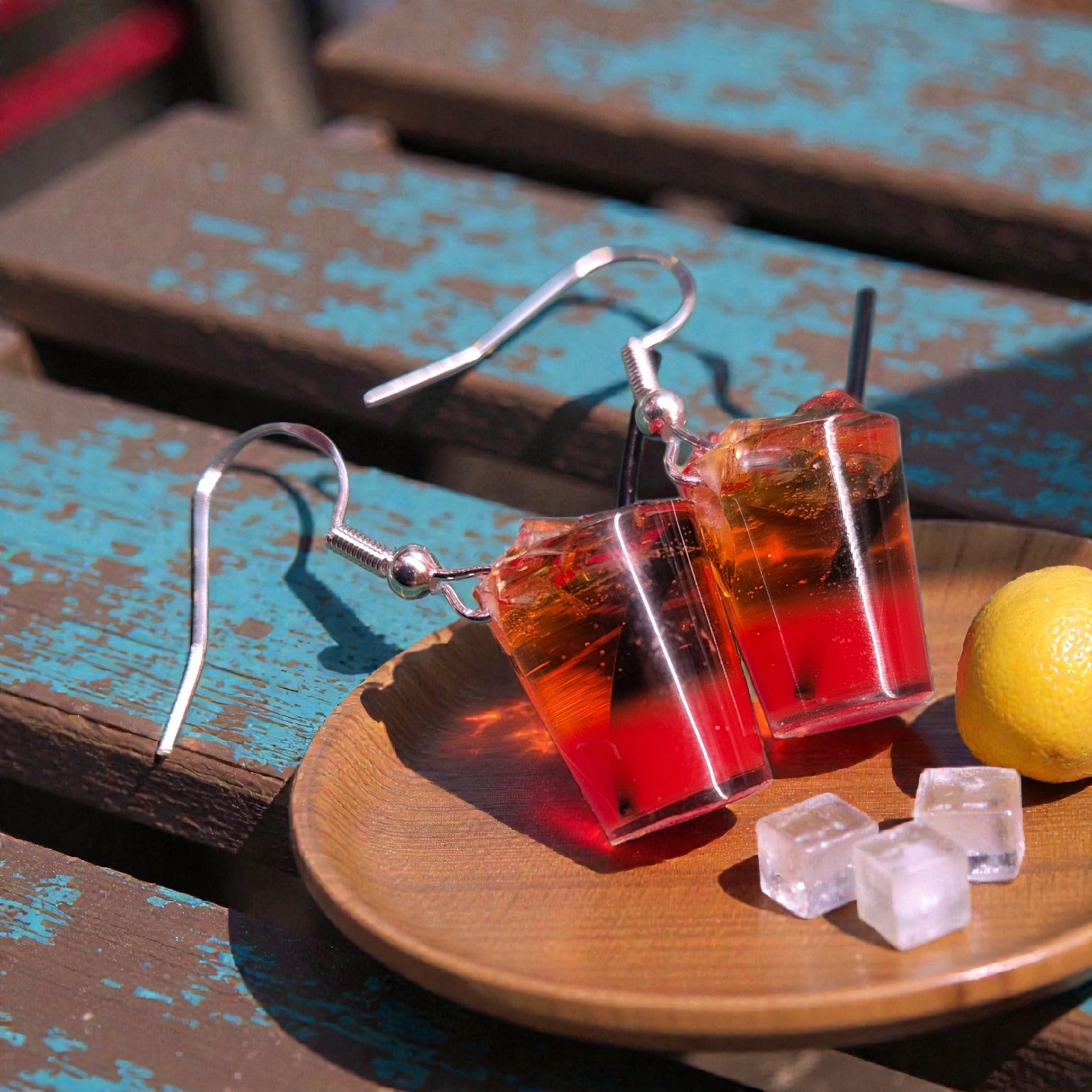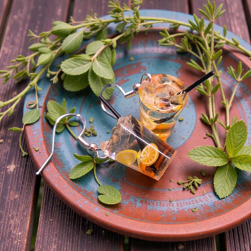 Miniatuur glaasjes met ijsblokjes en limonade aan sterling zilveren oorhaakjes