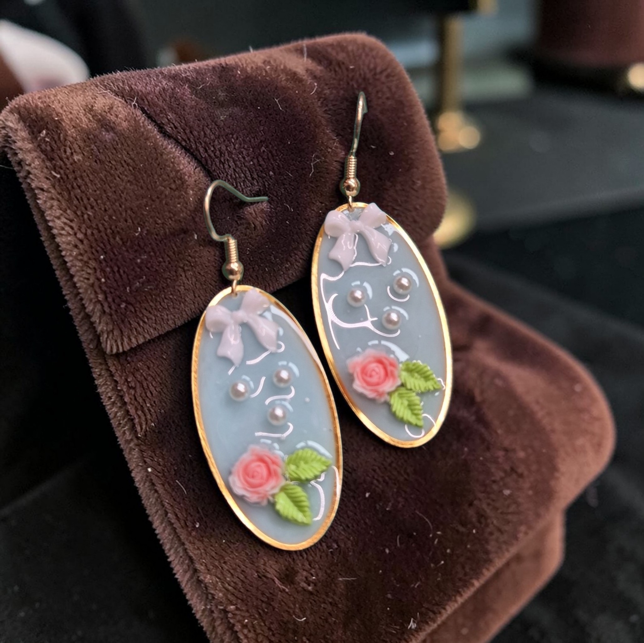 Goudkleurige hangertjes met epoxy en roosje en strikje aan 18k vergulde oorhaakjes