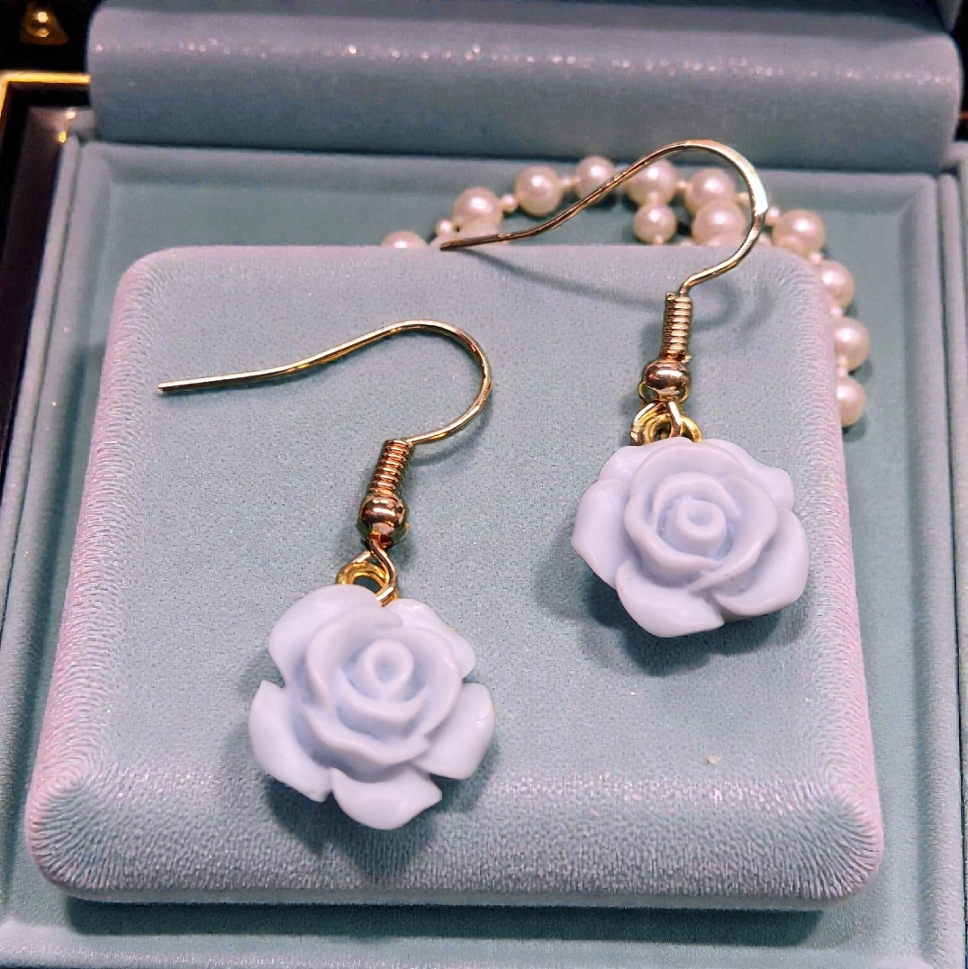 Mooie lichtblauwe roosjes aan 18k vergulde oorhaakjes