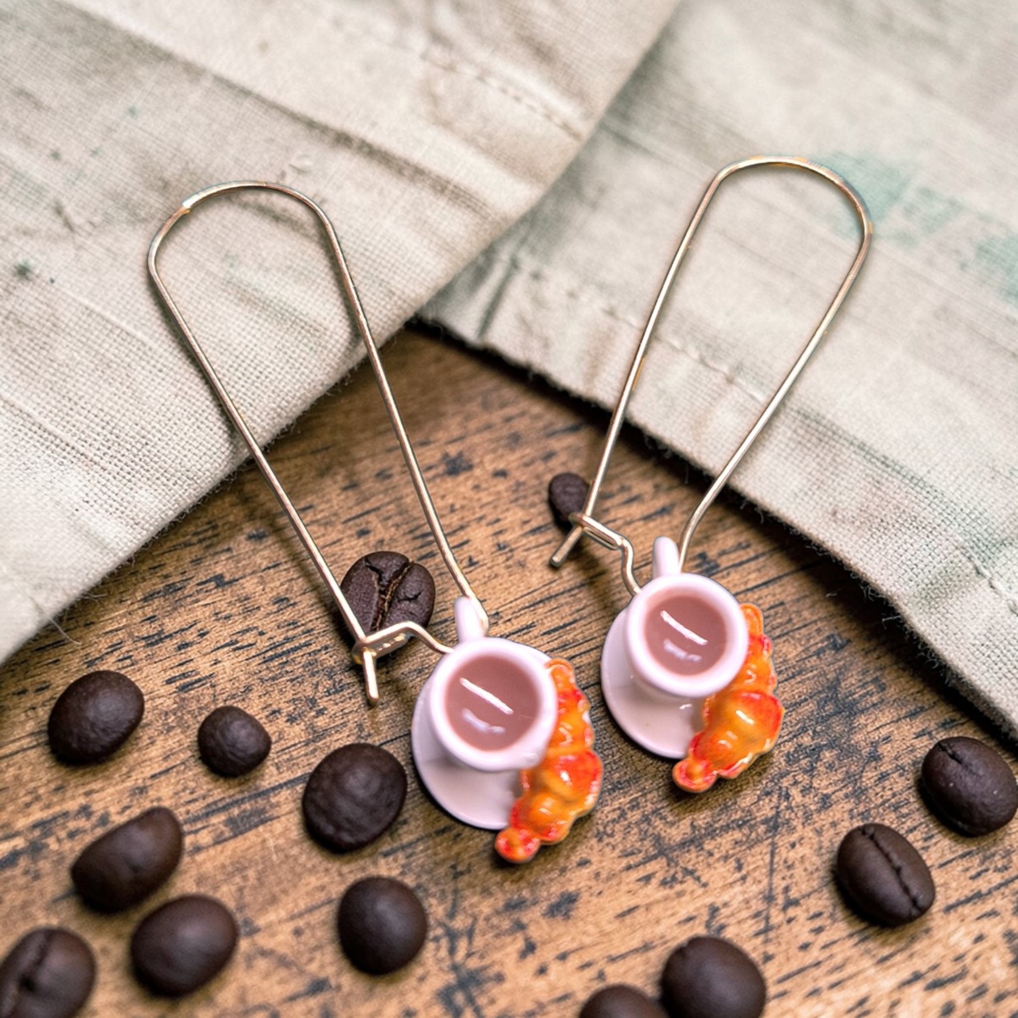Miniatuur tasjes koffie met croissant aan lange rvs haakjes