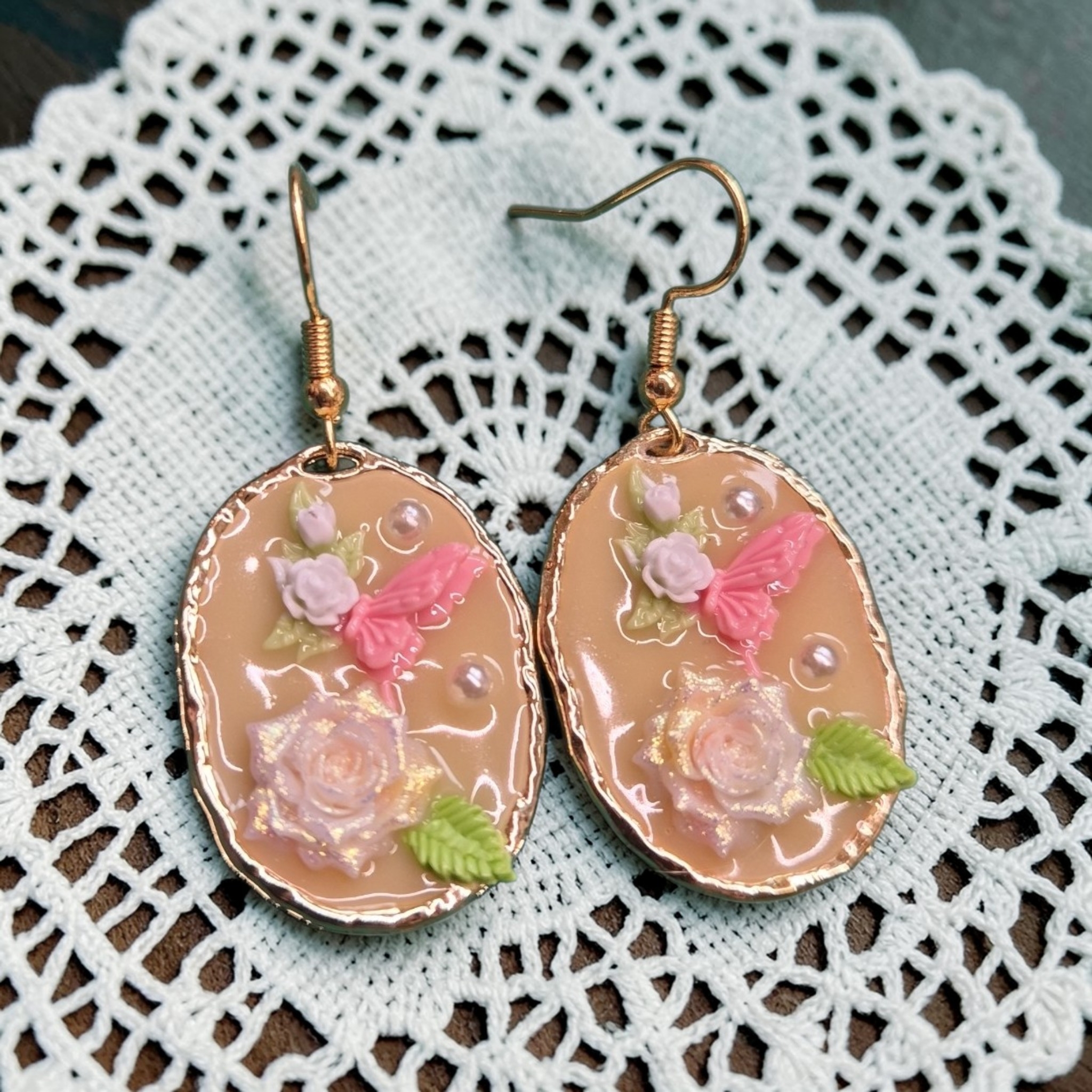 Goudkleurige hangertjes met epoxy aan 18k vergulde oorhaakjes