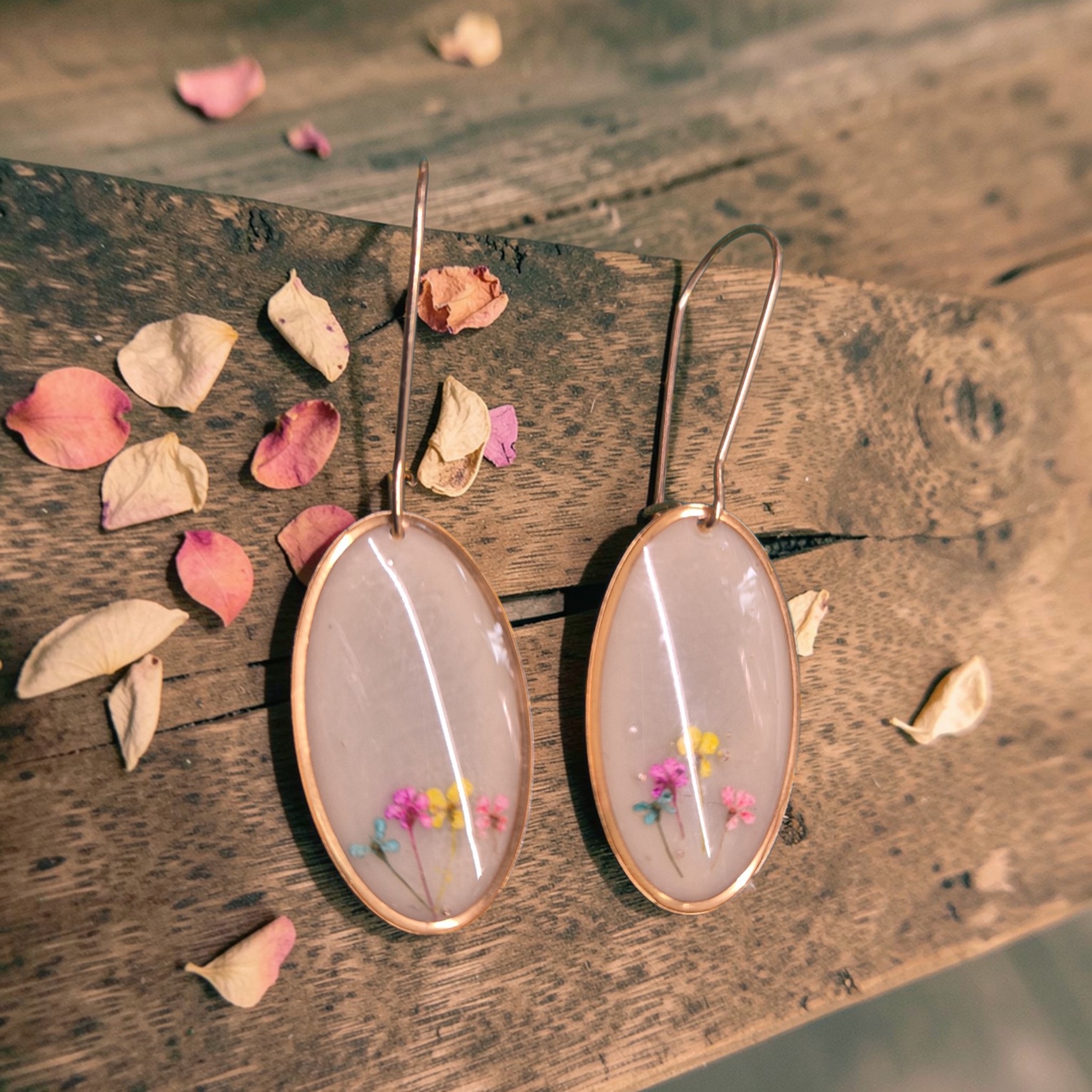 Goudkleurige ovale hangers met gedroogde bloemen in epoxy