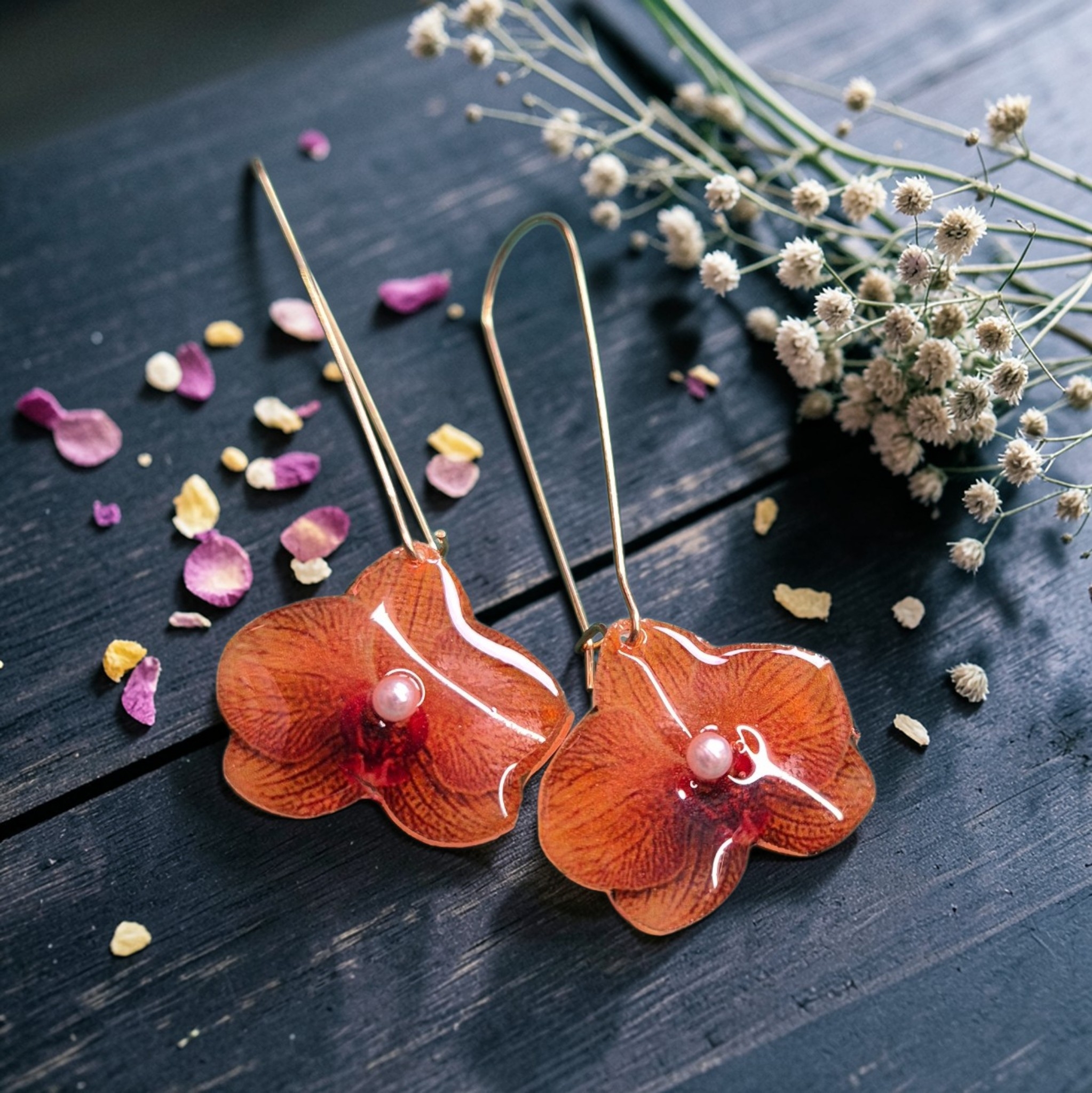 Mooie krimp orchideeën bewerkt met epoxy aan lange rvs haakjes
