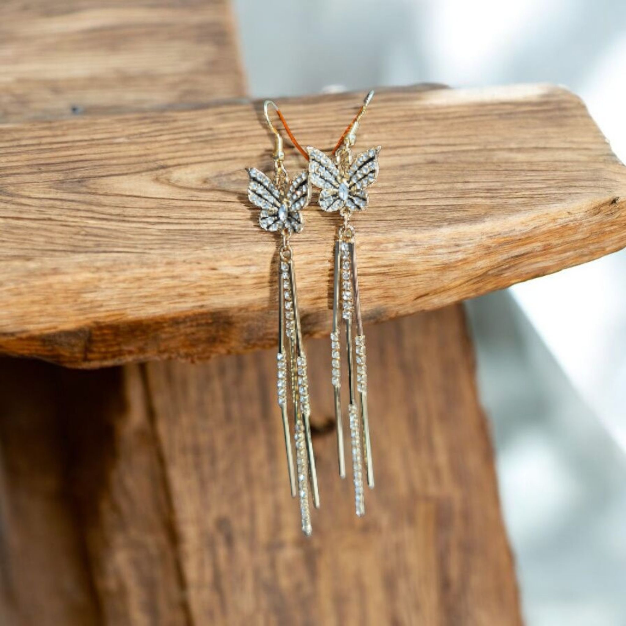Mooie lange oorbelletjes met vlinder en strassketting aan 18k vergulde oorhaakjes