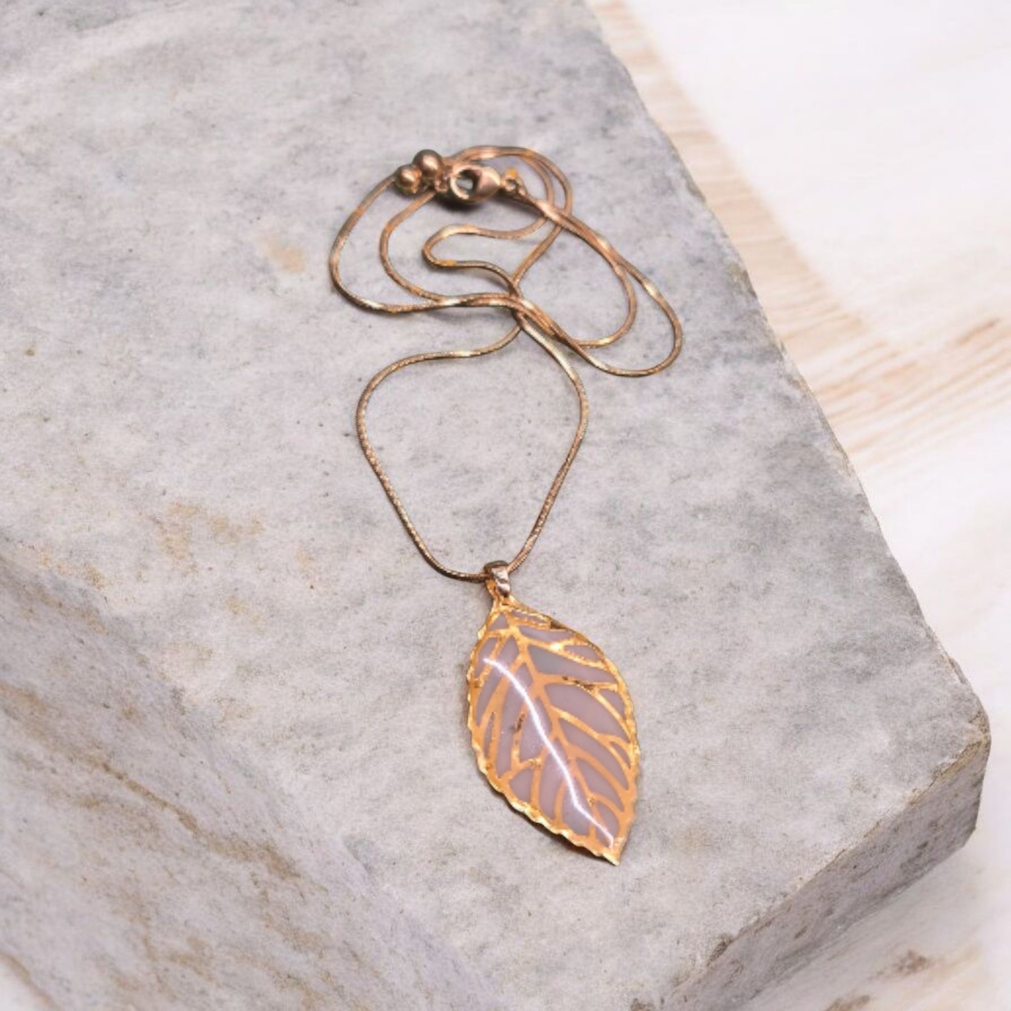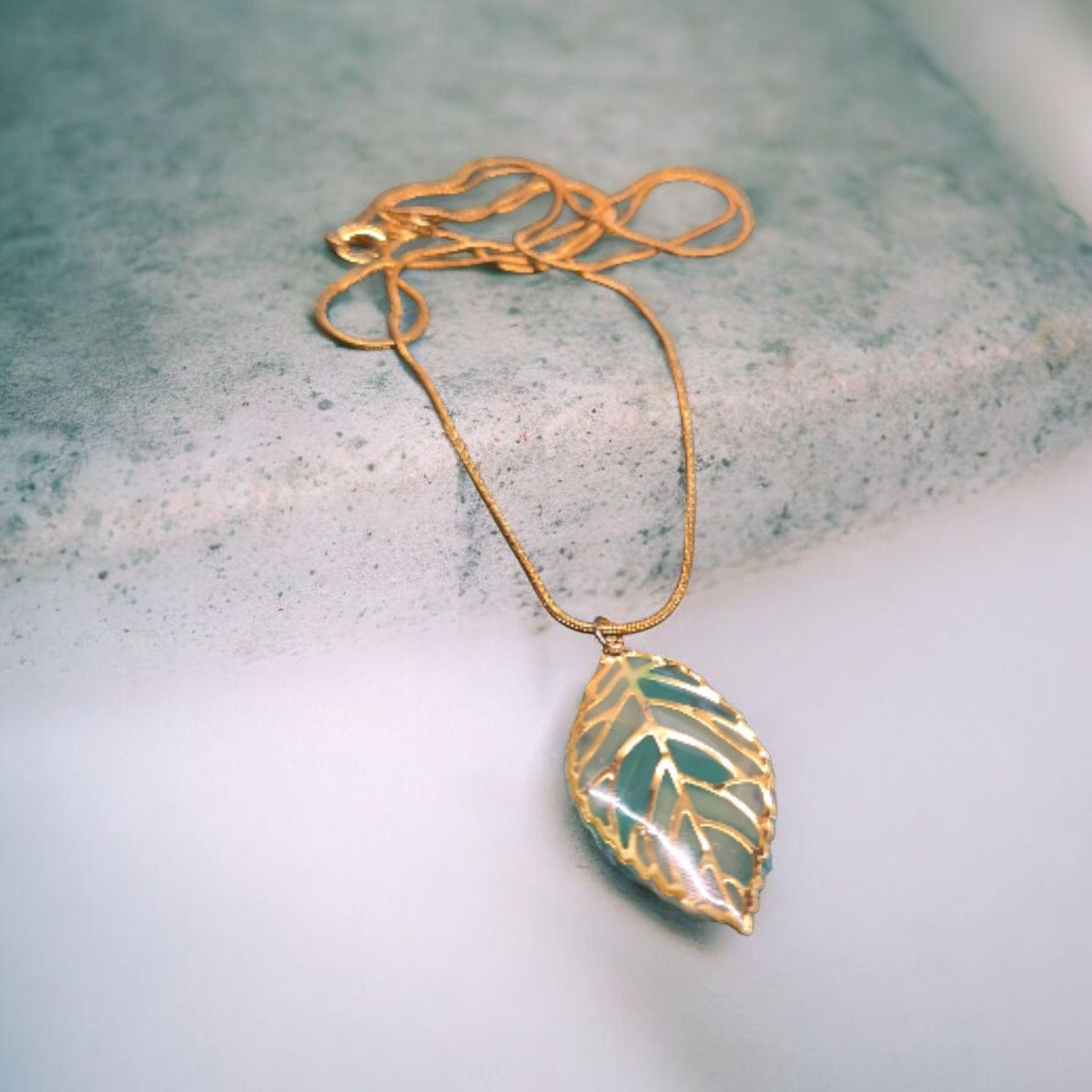 Mooie ketting met goudkleurig blad gevuld met epoxy